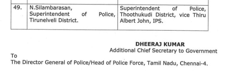 தூத்துக்குடி மாவட்ட எஸ்பியாக பணிபுரிந்து வந்த ஆல்பர்ட் ஜான் ஐபிஎஸ்க்கு ஏற்கனவே பணியிட மாற்றம் வந்து பணியிட மாறுதலுக்காக காத்திருந்தார். இந்த நிலையில் தற்போது தமிழகத்தில் 70-க்கும் மேற்பட்ட ஐபிஎஸ் அதிகாரிகள் பணியிட மாற்றம் செய்யப்பட்டுள்ள நிலையில் தற்போது ஏற்கனவே உள்ள பணியிட மாறுதலில் அவர் தூத்துக்குடியில் இருந்து பணி மாறுதல் ஆகி செல்ல உள்ளார். இந்த நிலையில் புதிய மாவட்ட எஸ்பியாக நெல்லை மாவட்ட எஸ்பியாக பணிபுரிந்து வந்த சிலம்பரசன் தூத்துக்குடி புதிய எஸ்பி ஆக நியமனம் செய்யப்பட்டுள்ளார்.